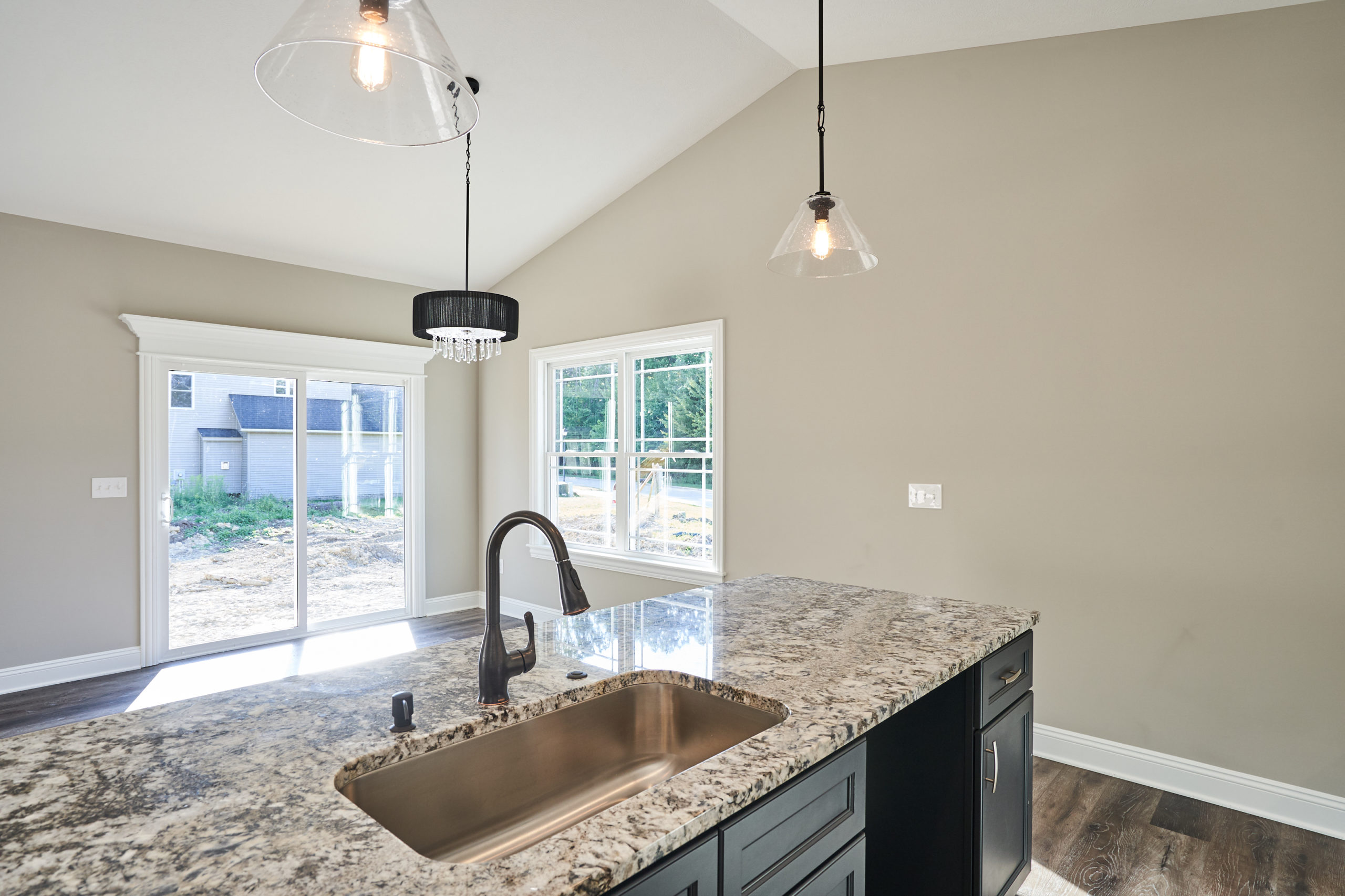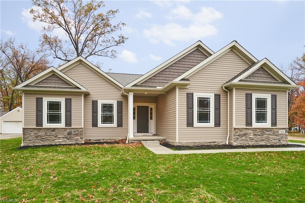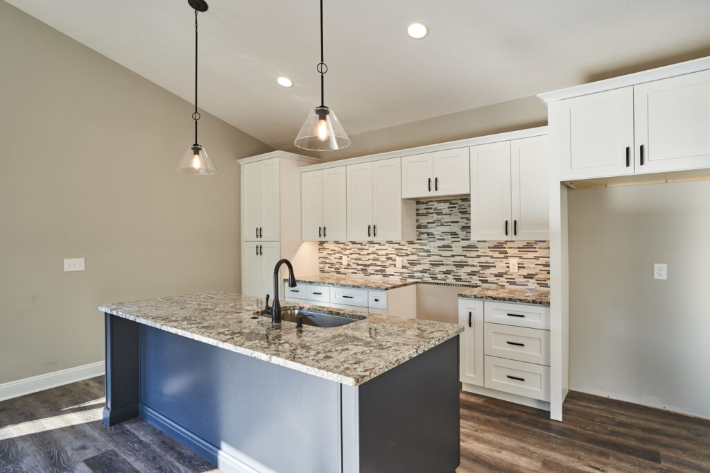 Contemporary ranch with vaulted ceilings and an open floorplan. Eat-in kitchen features an expansive center island with counter seating, granite countertops and is completely open to the great room.