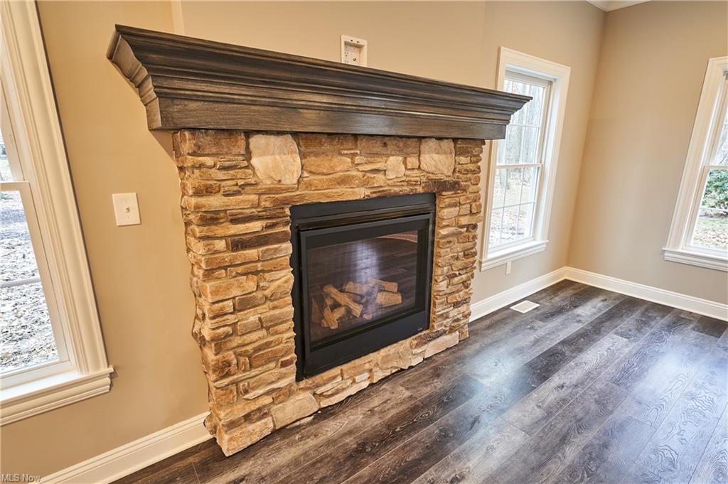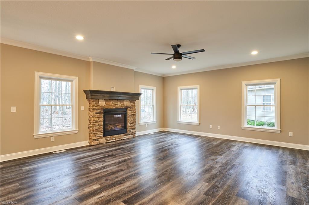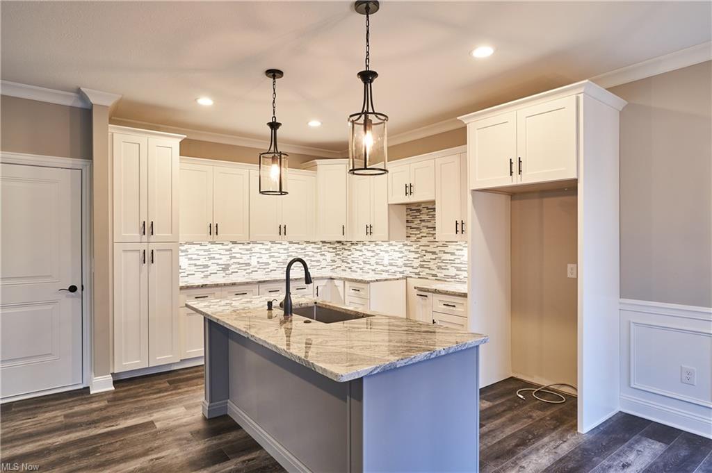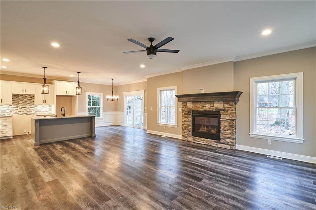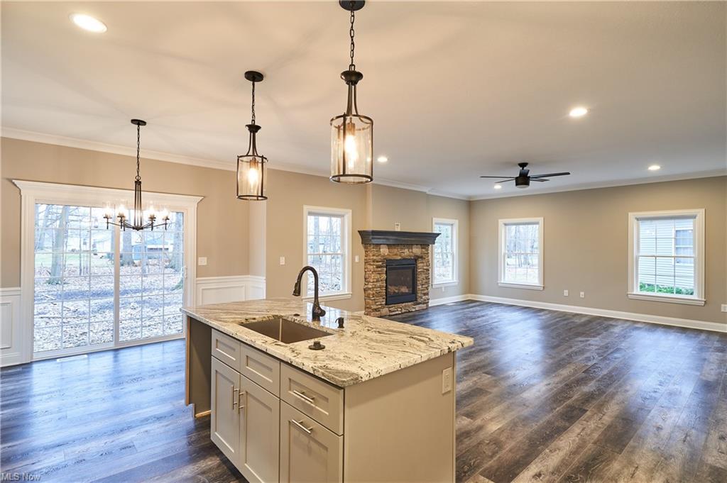 Inviting front porch with pillars. Eat-in kitchen features granite countertops, a tile backsplash, and an island. Greatroom with gas fireplace encased in stone.