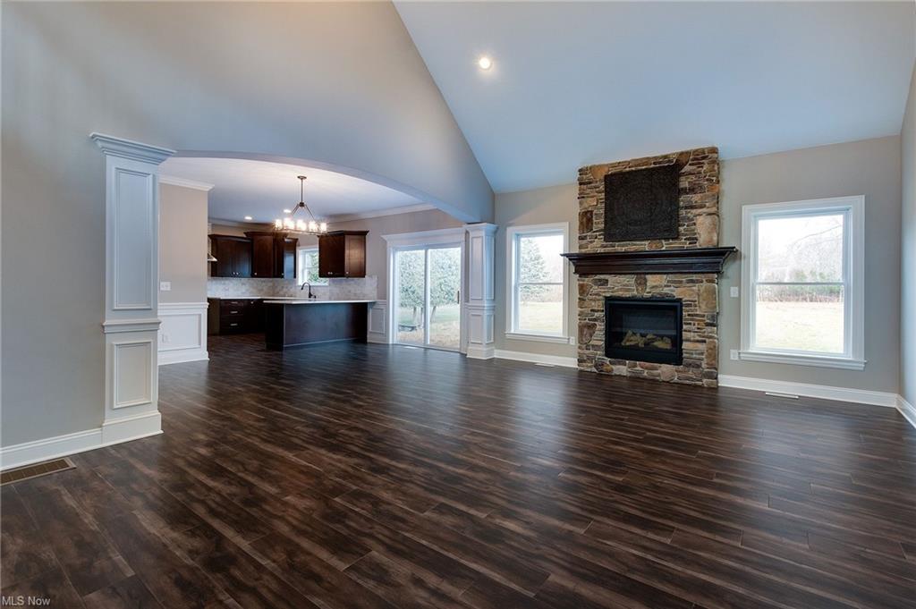 Eat-in kitchen features granite countertops with counter seating, stainless steel appliances and is open to the great room and dining areas.