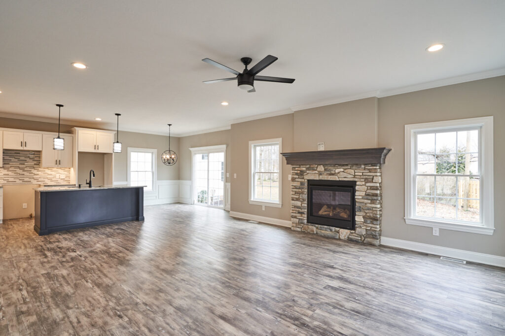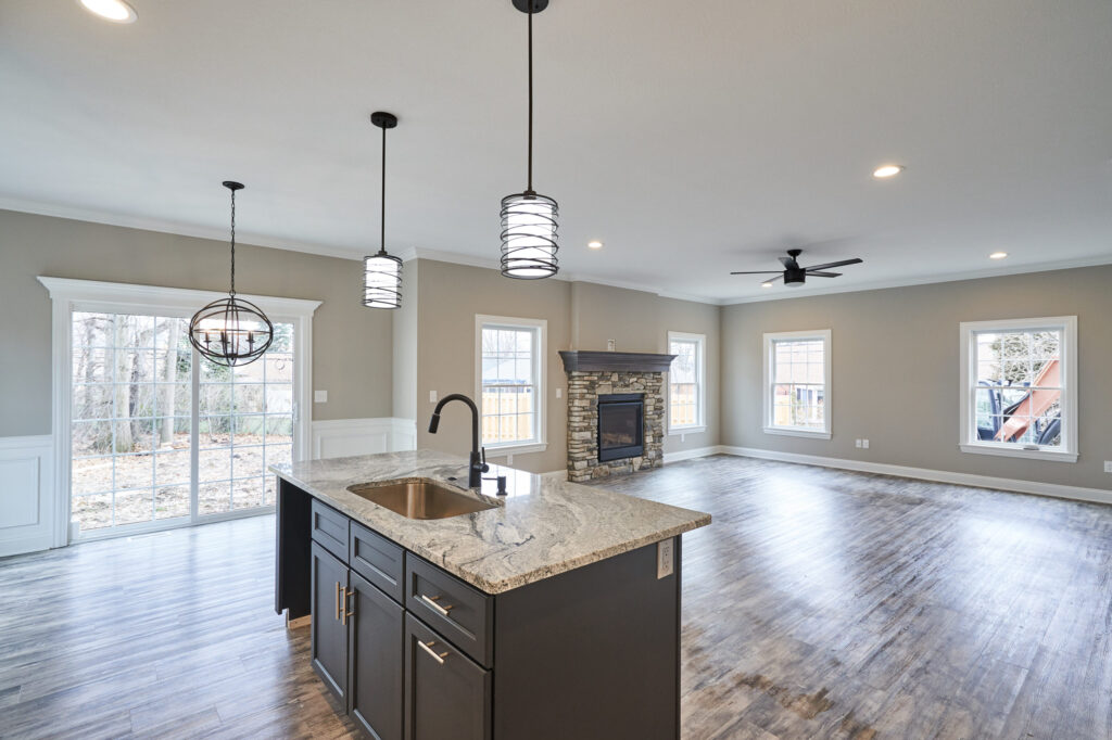 Inviting front porch with pillars. Eat-in kitchen features granite countertops, a tile backsplash, and an island. Greatroom with gas fireplace encased in stone.
