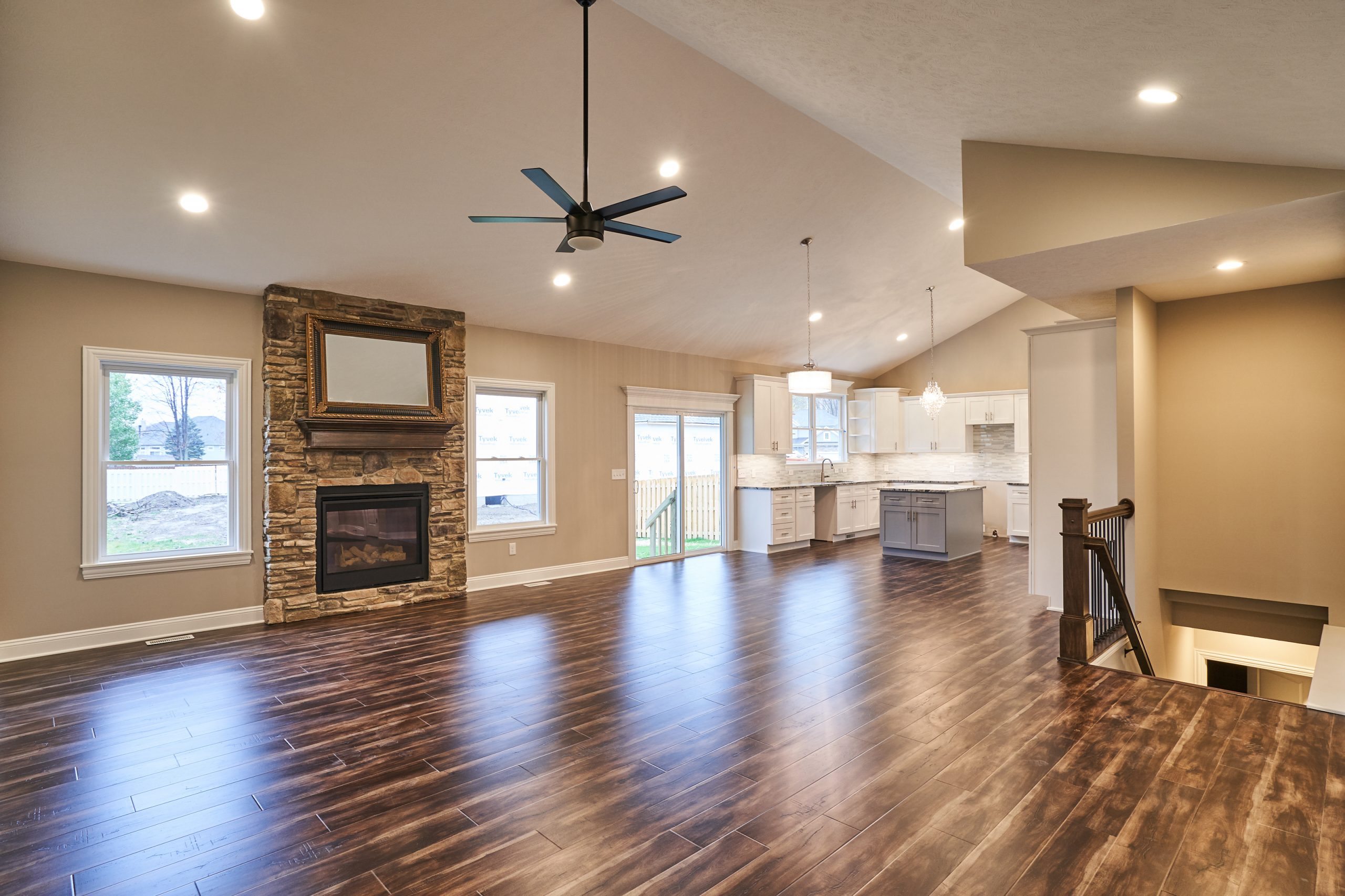 Contemporary ranch with vaulted ceilings and an open floorplan.