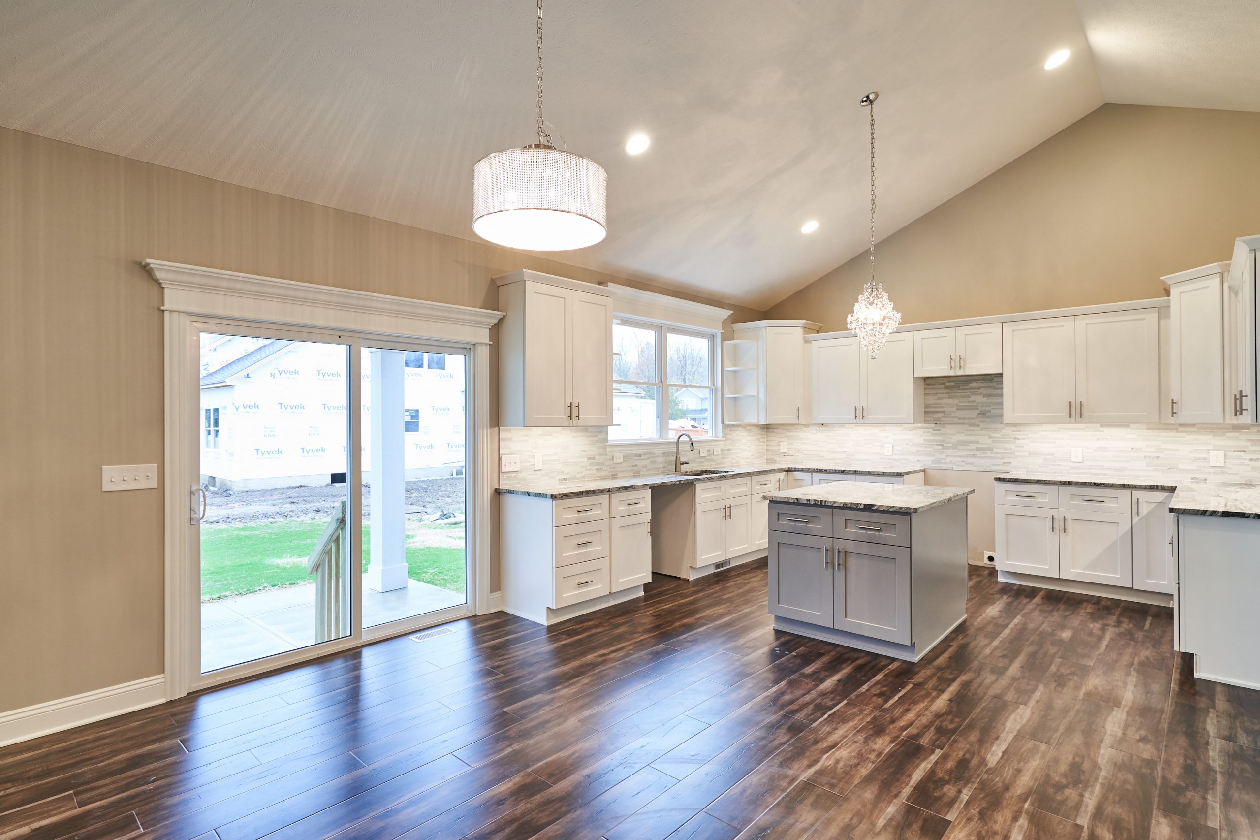 Eat-in kitchen features a center island with granite countertops and is completely open to the great room which walks out to the covered patio.