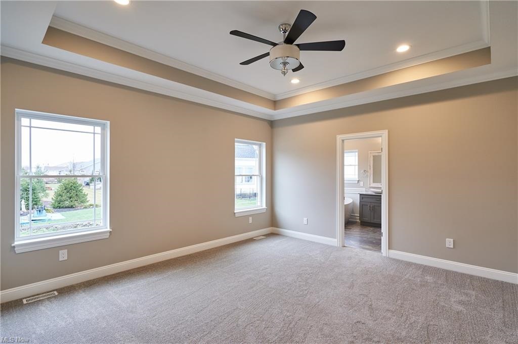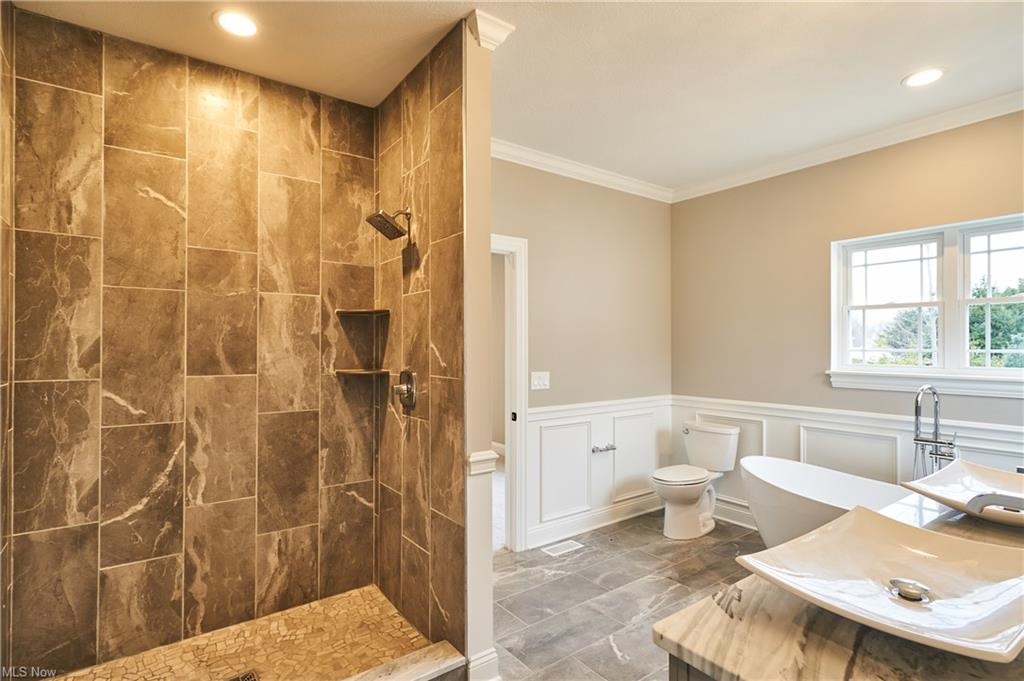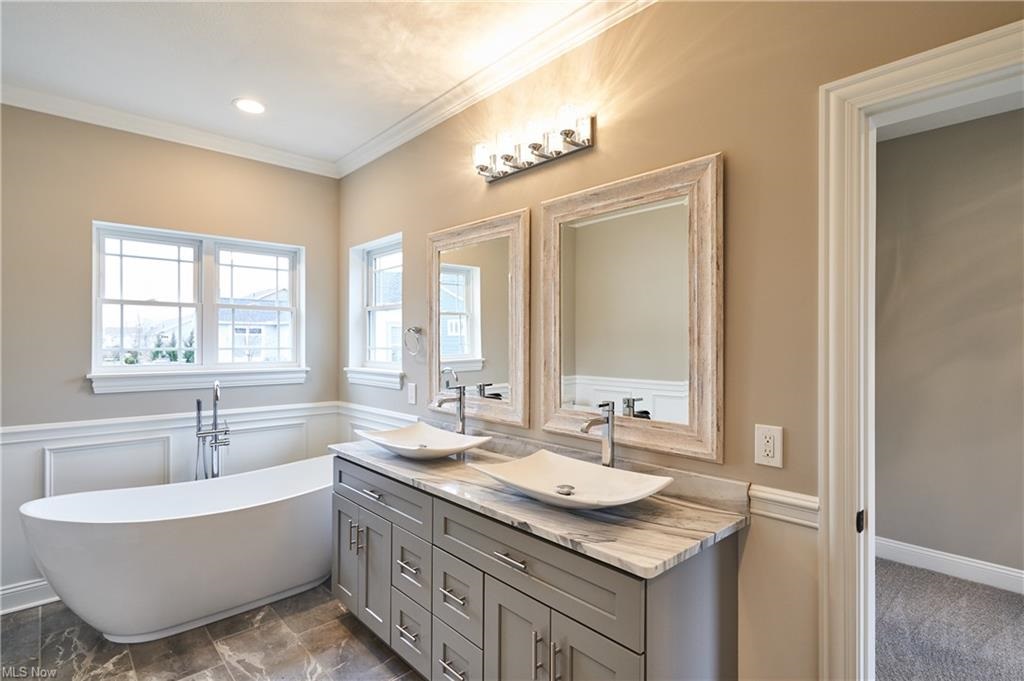First-floor master bedroom and private bath with tiled shower/stand-alone bathtub/walk-in closet.