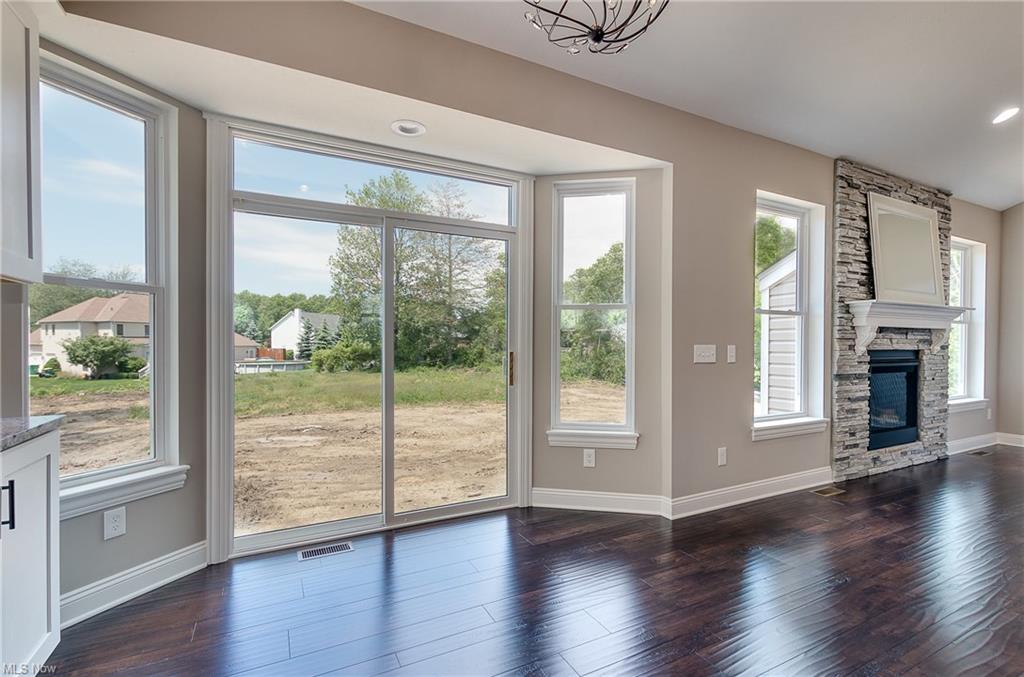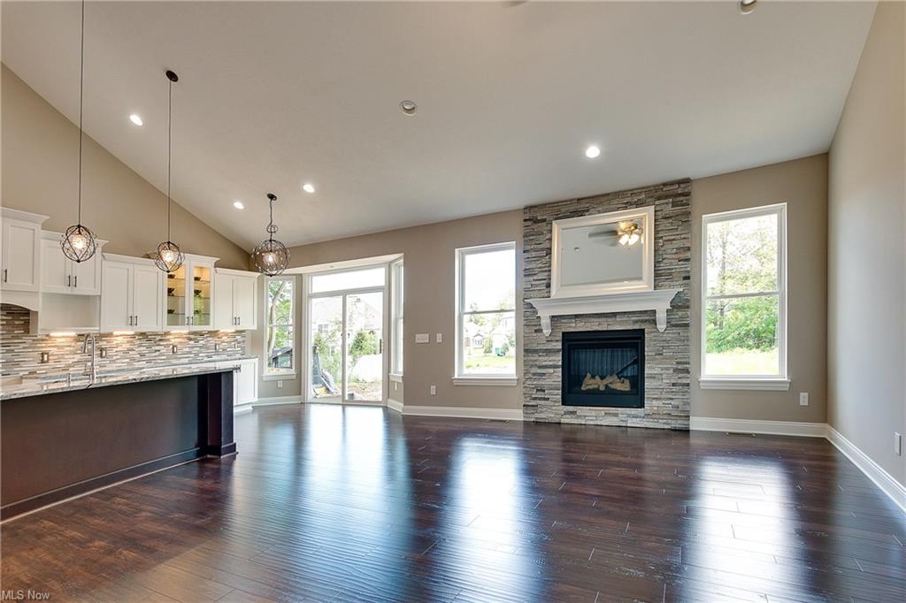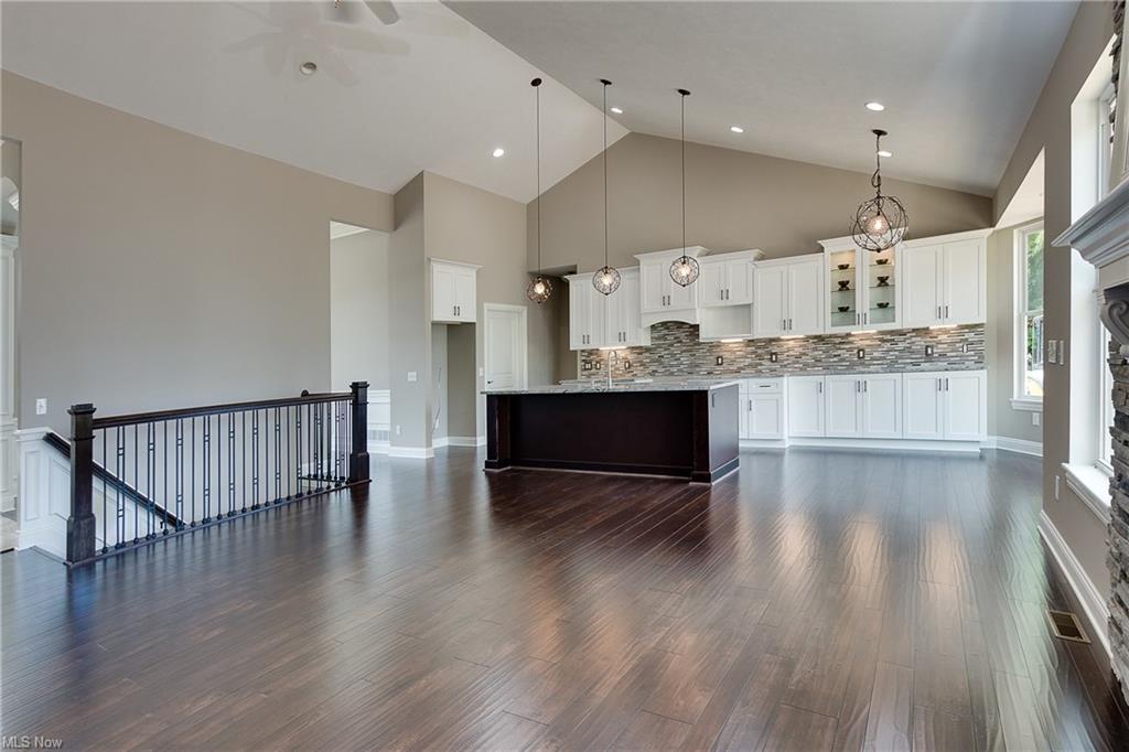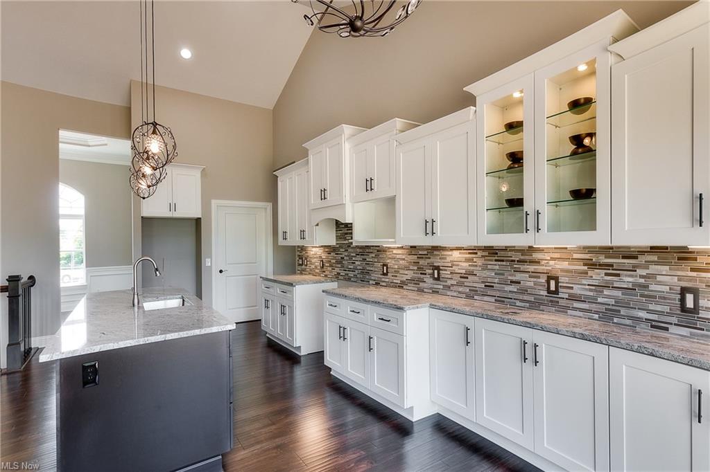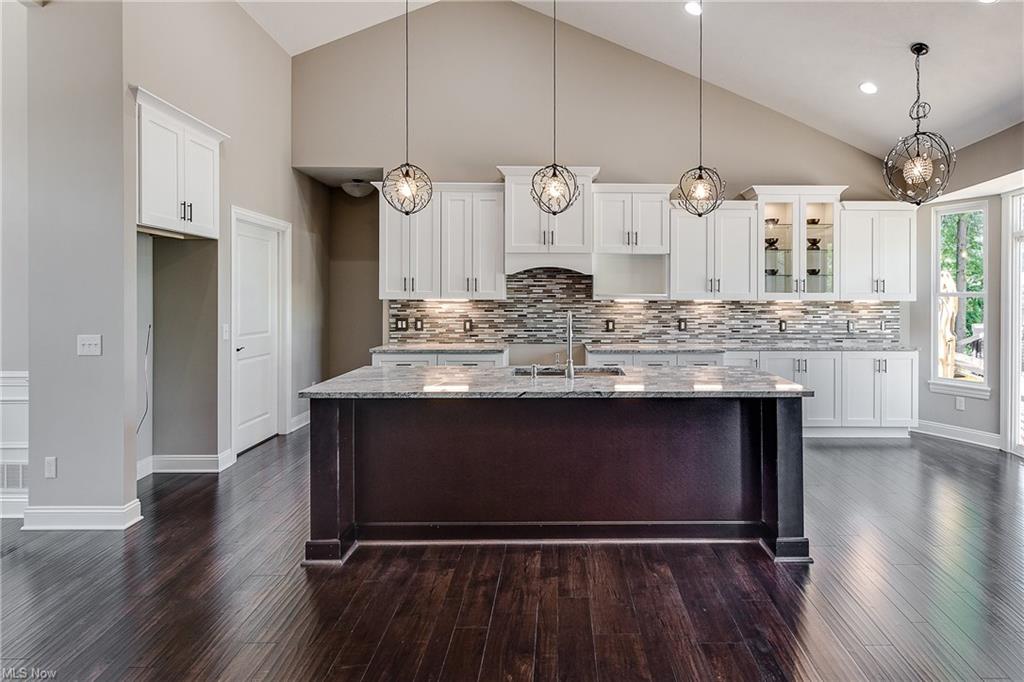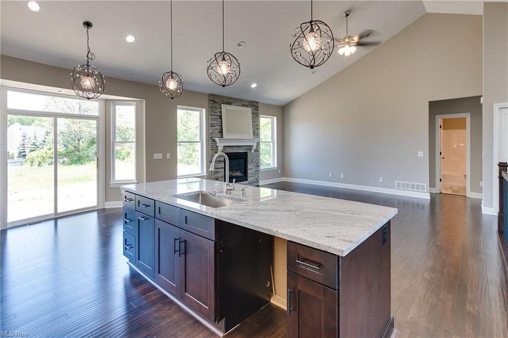 Eat-in kitchen features an expansive center island with counter seating, granite countertops, stainless steel appliances and is completely open to the great room and dining areas.